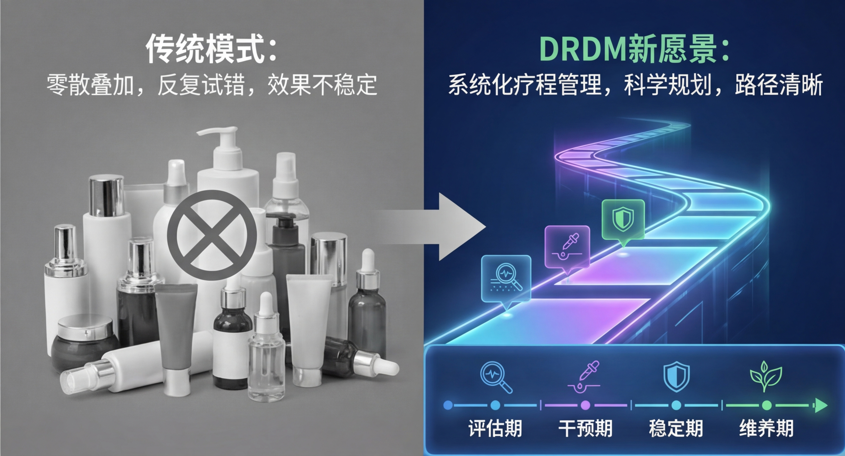 DRDM认为,真正有效的功能护肤,应该像管理一个“修复过程”,而非简单的产品使用行为。