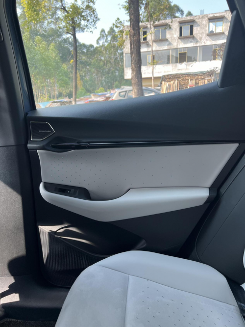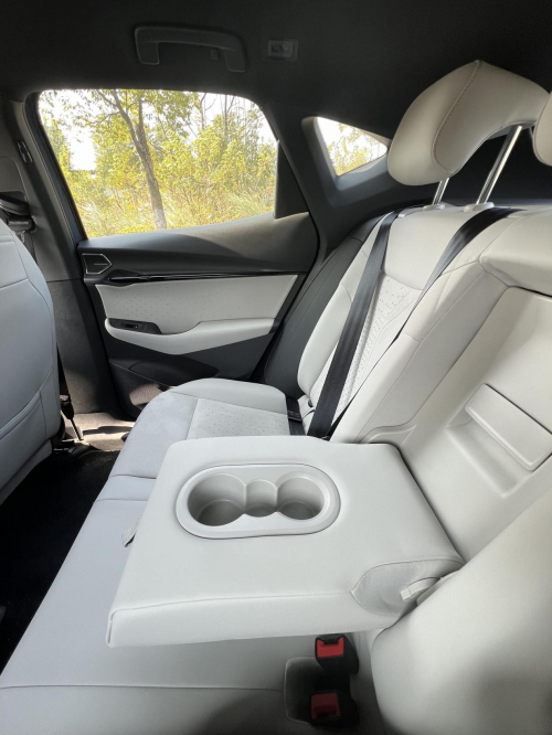 我身高1米8,在前排调好驾驶坐姿后,我也特意去后排试了一下。大家担心的溜背压头问题,其实与众06处理得还可以。他们在头顶的位置做了掏空处理,所以我坐直了头发虽然会扫到一点顶棚,但不会觉得压抑。腿部空间倒是很宽裕,大概还有两拳的距离,翘个二郎腿问题不大。而且地板虽然不是纯平,但隆起很小,中间坐个人短途应急也没啥问题。