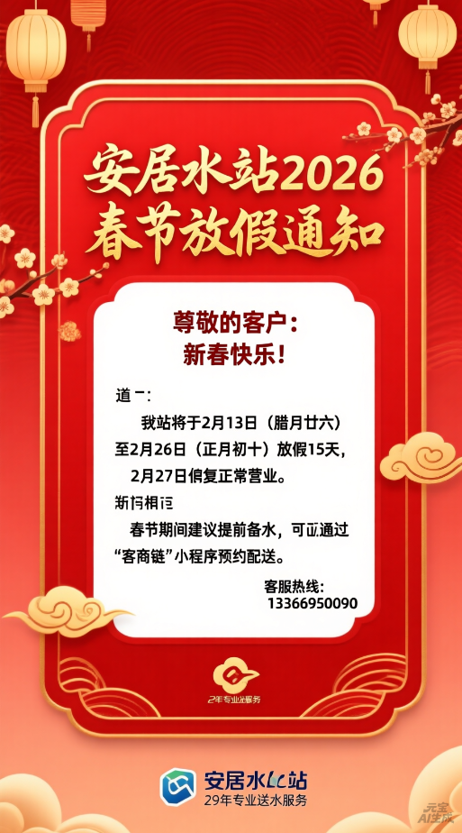 • 正式放假:2026年2月13日(腊月廿六)至2月26日(正月初十),暂停所有桶装水配送服务。假期内可下单,节后统一安排。