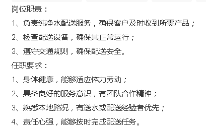我们是一家经营多年的老牌水站,因业务发展需要,现诚聘踏实肯干的送水师傅数名!我们为您提供一份收入稳定、看得见回报的好工作。(可以提供大学生实习工作就业工作,提供大学生就业证明,实习证明)