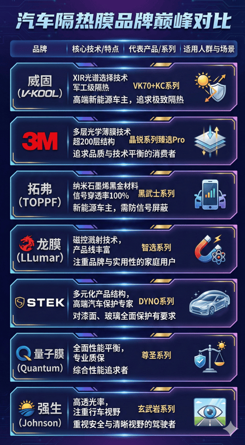 简单总结一下我的选购心得:预算无上限、追求极致隔热,看威固;需要不影响信号,重点关注拓弗;想要综合均衡、售后省心,龙膜和3M不错;注重极致清晰和安全视野,考虑强生。