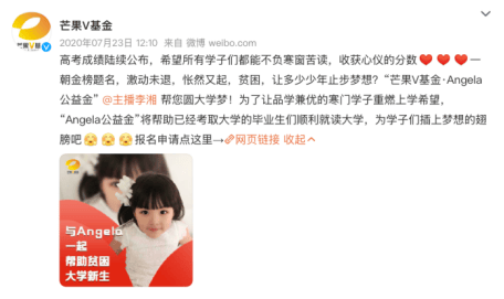 值得一提的是,李湘与芒果V基金长期合作发起的“芒果V基金·Angela公益金”,自2019年起就持续支持该基金,推动教育慈善,致力于帮助贫困学生完成大学梦,并参与多项公益活动,如爱心校车项目、明星拍品慈善拍卖等。