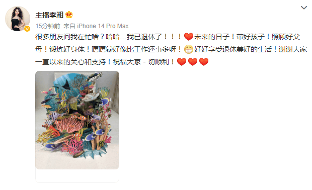2023年8月31日,李湘在个人社交平台正式官宣退休,简短的文字里满是从容与释然:“已退休,未来好好陪伴家人,照顾父母,养育女儿,享受生活。”这一决定,再次让外界看到她的通透与洒脱——在事业功成、实现财富自由后,主动放下光环与忙碌,回归最本真的生活。