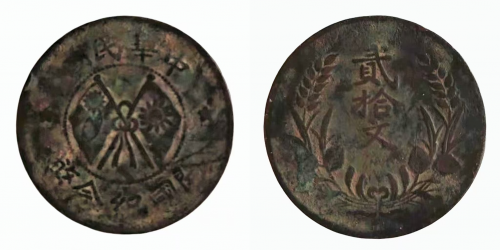 由于甘肃地处偏远,缺乏先进的机器设备,这枚贰拾文铜币采用手工翻砂法铸造,工艺上融合了传统方孔钱与近代机制币的特征,形制粗犷却力道十足,文字苍劲而质朴,每一枚都是工匠亲手打造的孤品,带着西北黄土高原的厚重与坚韧,是民国地方铸币史上最具生命力的篇章。这种 “手工共和币” 的身份,让它在海量机制双旗币中脱颖而出,成为无可替代的地域珍品。