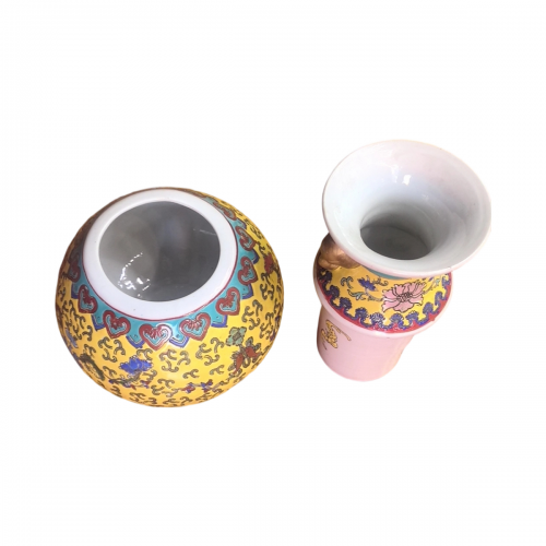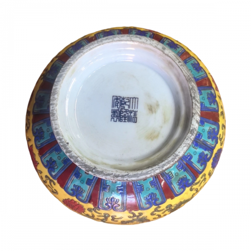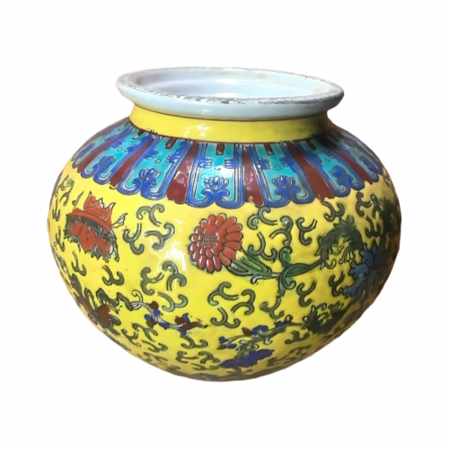 地色与主纹:通体以明黄釉为地,黄釉是清代皇家专属色,只有皇帝、皇后可用,民间禁用,彰显了器物的御窑身份。黄地上以粉彩满绘缠枝花卉纹,包含牡丹、莲花、菊花、宝相花等,花卉色彩丰富,粉、红、蓝、绿、金等多色晕染自然,花瓣层次分明,枝叶缠绕流畅,寓意 “富贵连绵、生生不息”。