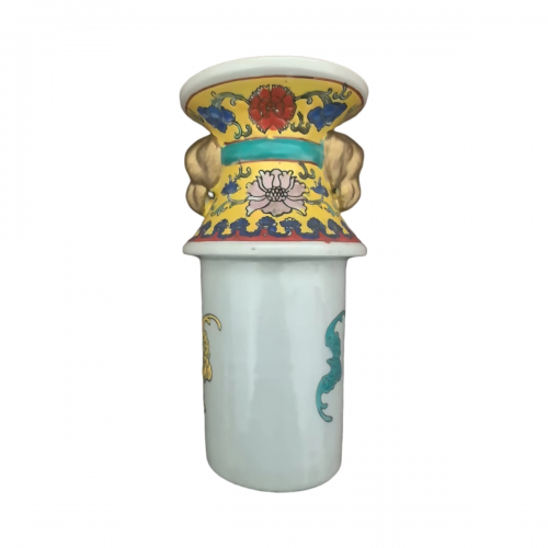 辅助纹饰:颈部、肩部、近足处分层装饰如意云头纹、莲瓣纹、蕉叶纹等,以松石绿、矾红、描金勾边,纹饰布局严谨,主次分明,既符合清代官窑 “繁而不乱” 的装饰风格,又强化了器物的等级感。
